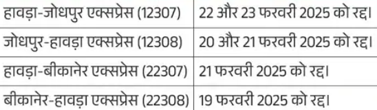 - ट्रेन नंबर – 12308 जोधपुर-हावड़ा 20 और 21 फरवरी को रद्द रहेगी